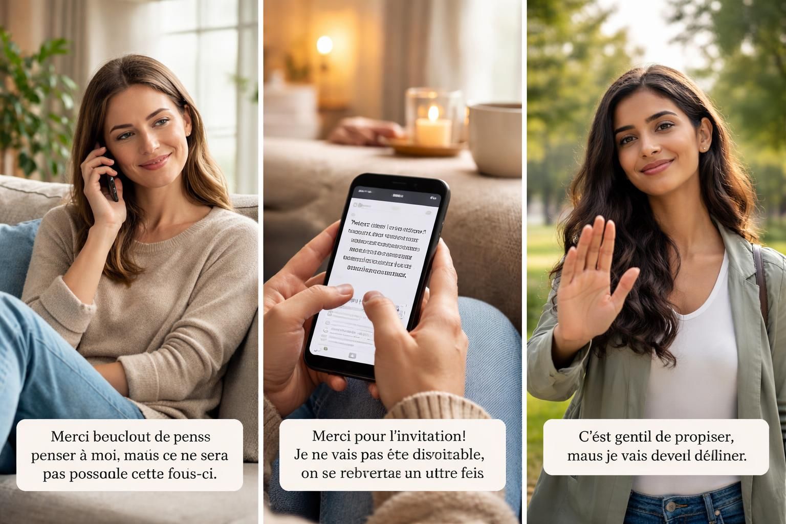 Ces formulations montrent la façon d’établir des limites sans créer de tension. En intégrant un remerciement et en gardant un ton positif, il est possible de décliner une invitation sans culpabilité.